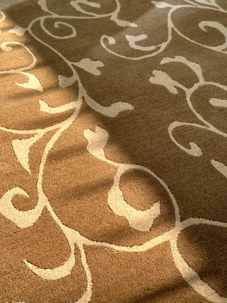 This exquisite hand-knotted wool and silk rug features an elegant vine-like pattern, adding a touch of sophistication to any space. The base is crafted from premium wool, providing durability and warmth, while the intricate floral motifs are woven with fine silk, creating a subtle sheen that enhances the design's depth and texture. The earthy brown tones combined with soft ivory accents give the rug a timeless appeal, making it a perfect choice for both classic and contemporary interiors. The luxurious feel and meticulous craftsmanship reflect a blend of tradition and artistry, making this rug a statement piece in any setting