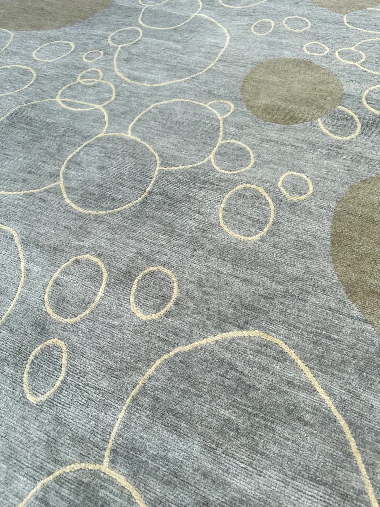 Inspired by floating bubbles and flowing water, Bubble Drift embodies lightness and fluidity. Its organic circles and soft gold outlines add a touch of elegance against a serene gray-blue backdrop. A perfect blend of motion and balance, this rug brings harmony and sophistication to any space.